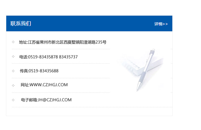 地址:常州市新北區友邦商務大廈1幢16、17層  電話:0519-85101652  傳真:0519-85112595  郵編:213022  網址:www_cz-jiayue_cn.szhagk.com  郵箱:xiajifengaa@163.com